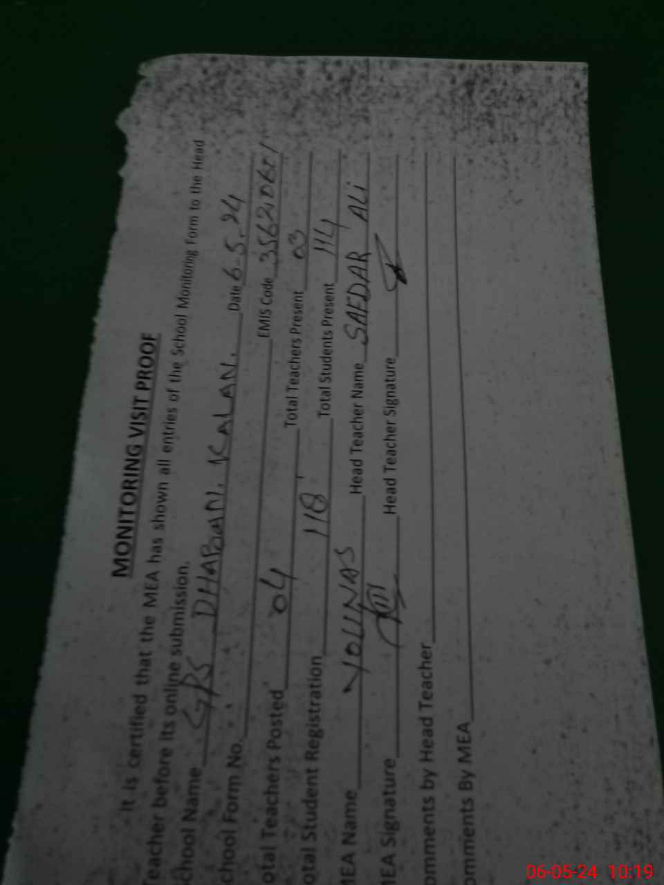 | Certified that this School was Inspected by the Undersigned MEA/DMO Today and the Information Stated Above is as Per Record. | |||||