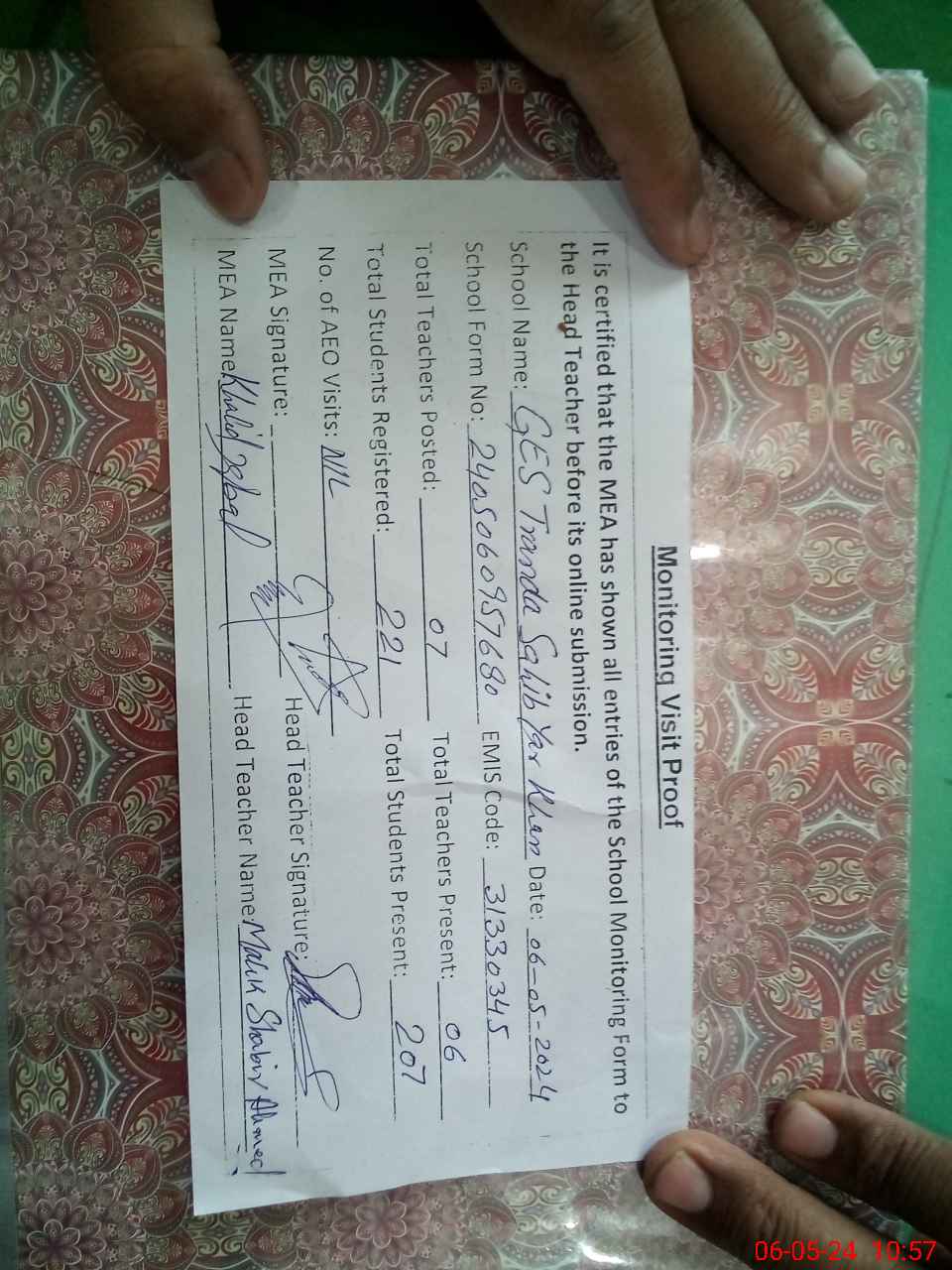 | Attendance Register | Head Teacher | MEA with School | Visit Proof |