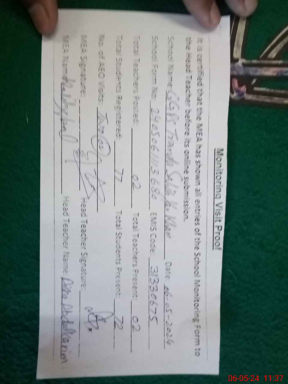 | Remarks (Use Separate Page if Required): Class verification is not updated on MEA tab as per sis and two classes are sitting in veranda | |||||