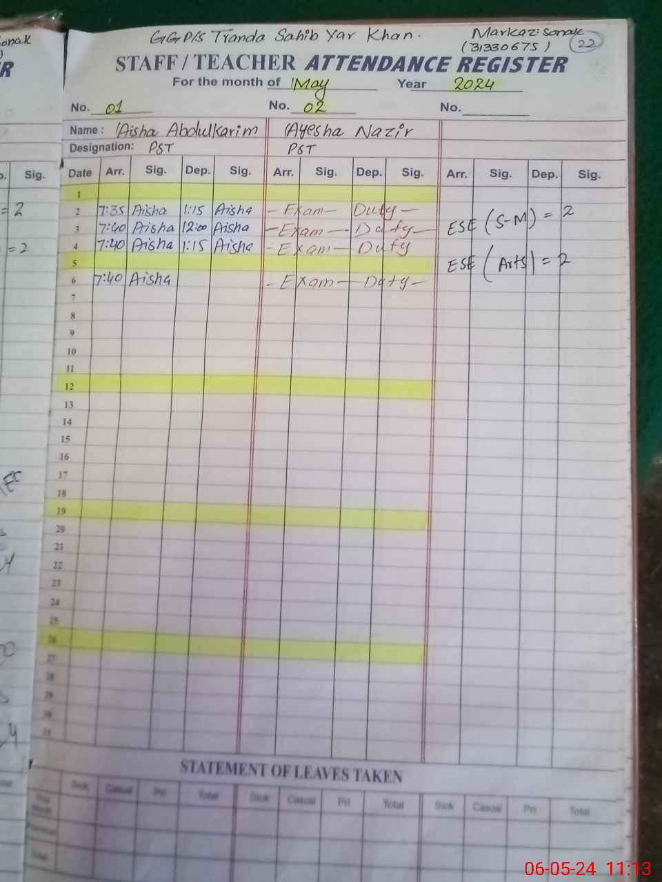 | 31**** | Ay**** Na**** | 1 | 1 | 8 | 0 | 0 | 0 | 0 | 0 | 0 | 1 | Exam Duty | |