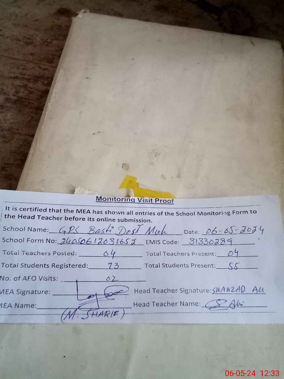 | Attendance Register | Head Teacher | MEA with School | Visit Proof |