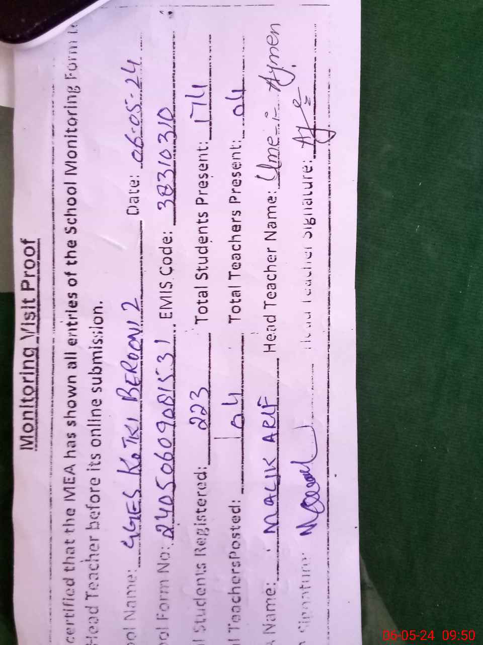 | Attendance Register | Head Teacher | MEA with School | Visit Proof |