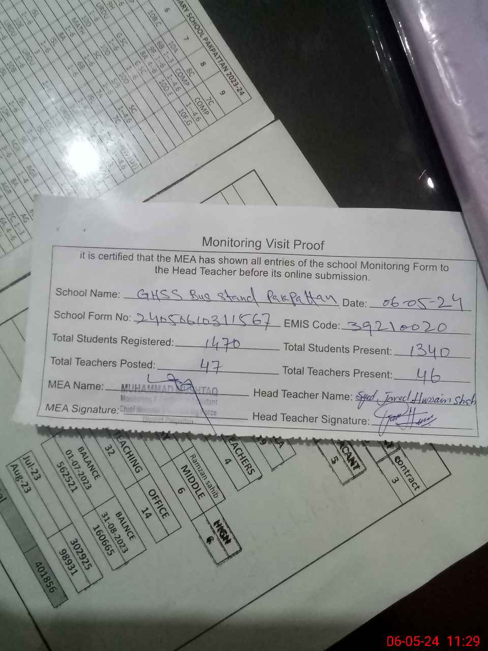 | Attendance Register | Head Teacher | MEA with School | Visit Proof |