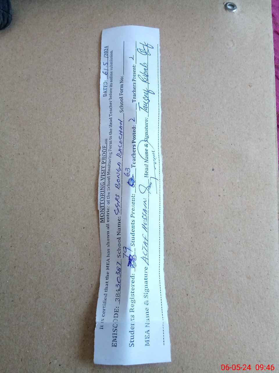 | Attendance Register | Head Teacher | MEA with School | Visit Proof |