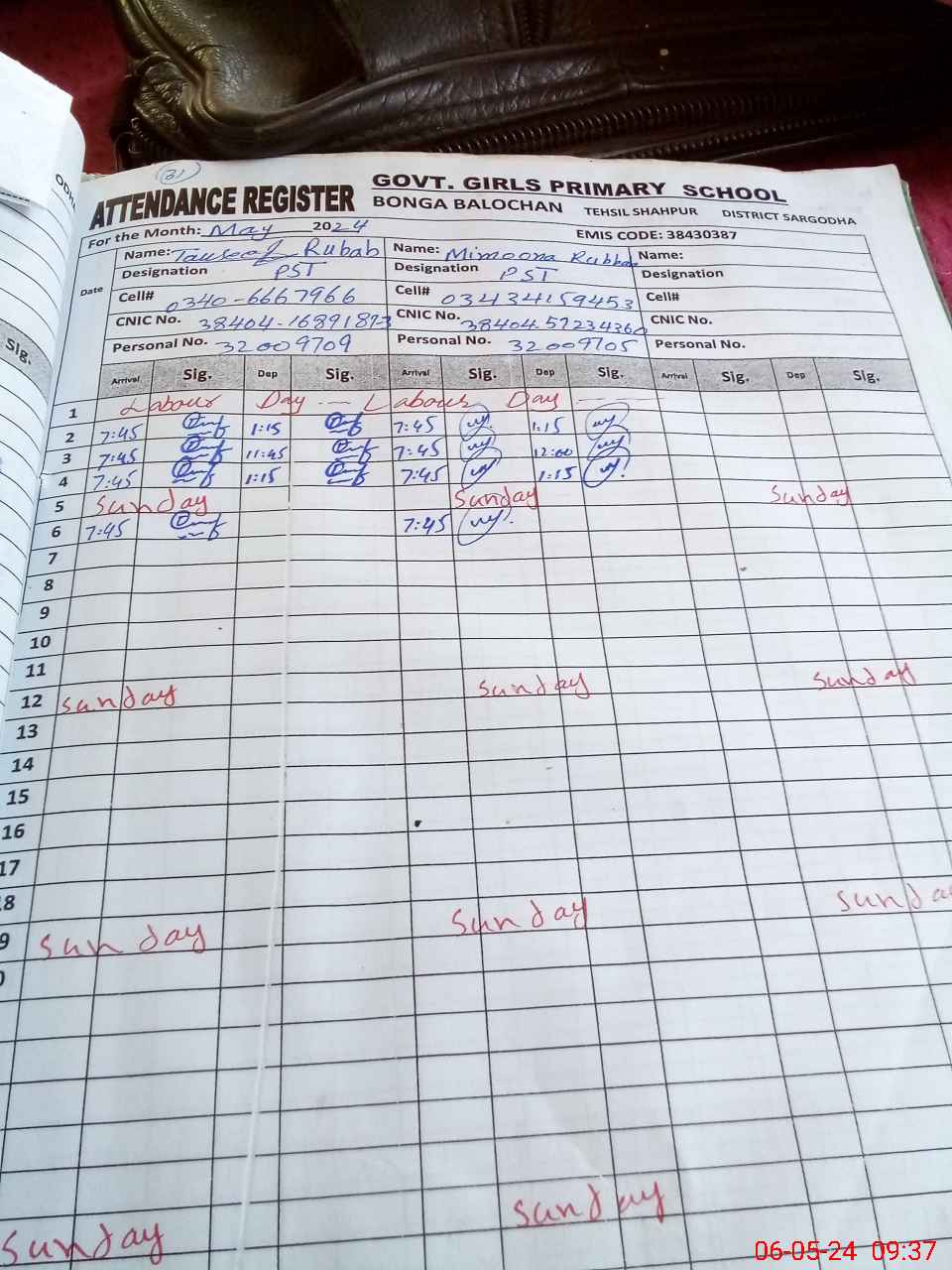 | CNIC | Full Name | Designation | R/C | Absence During Last Calender Month |