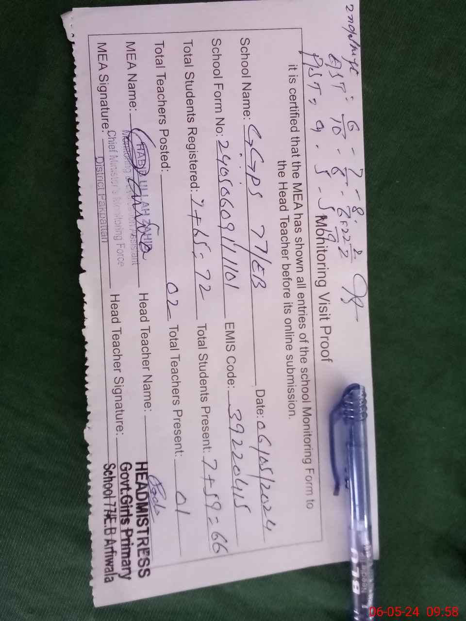 | Attendance Register | Head Teacher | MEA with School | Visit Proof |