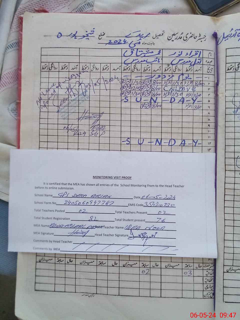 | Attendance Register | Head Teacher | MEA with School | Visit Proof |