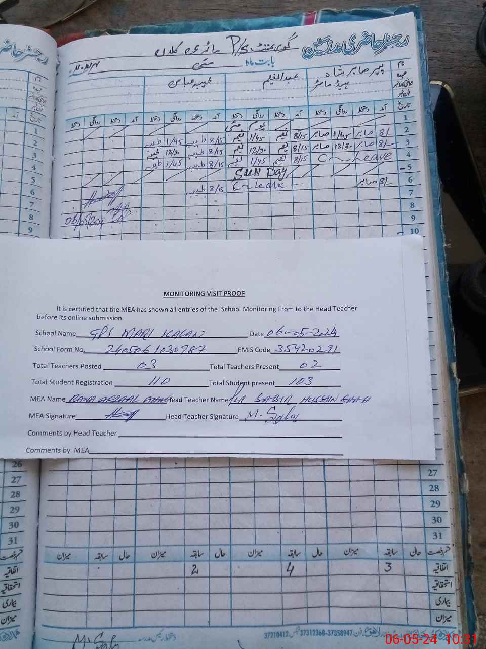 | Attendance Register | Head Teacher | MEA with School | Visit Proof |