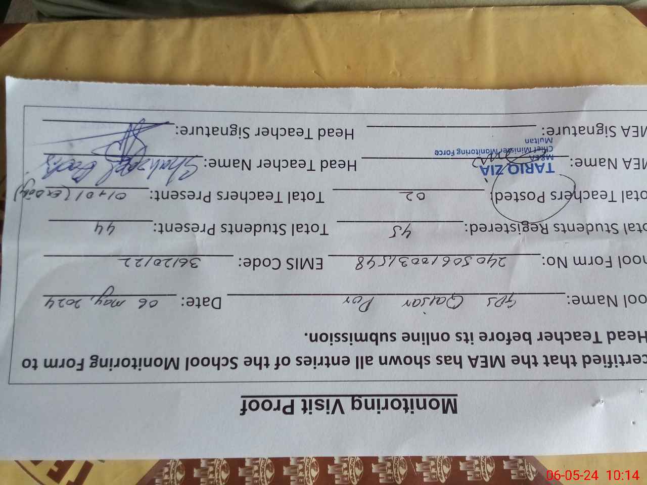 | Monitoring Date: 06-05-2024 | Start Time: 06-05-2024 09:47 AM | End Time: 06-05-2024 10:20 AM | Name of MEA: Mu**** Ta**** Zi**** | |