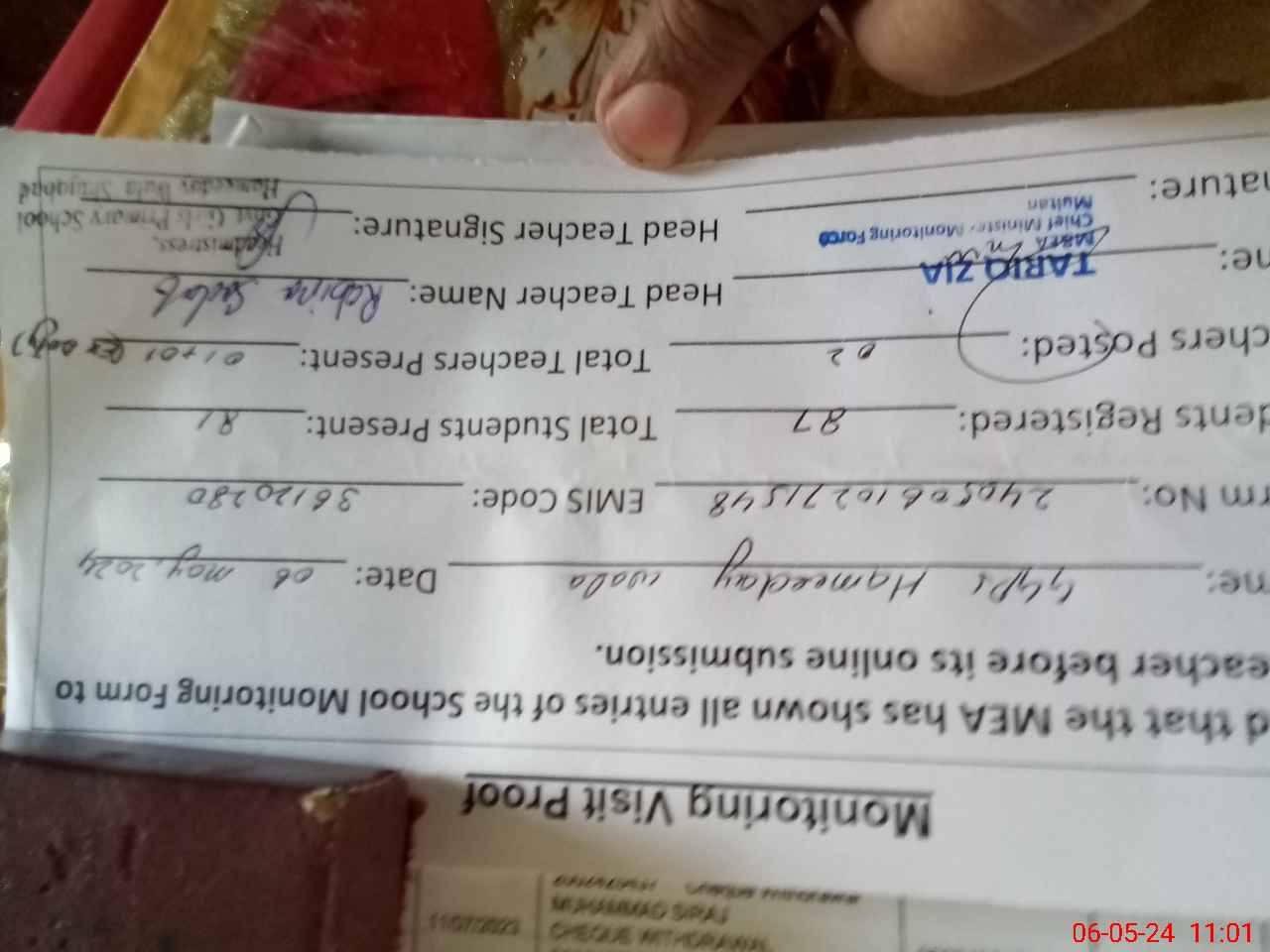 | Monitoring Date: 06-05-2024 | Start Time: 06-05-2024 10:27 AM | End Time: 06-05-2024 11:01 AM | Name of MEA: Mu**** Ta**** Zi**** | |