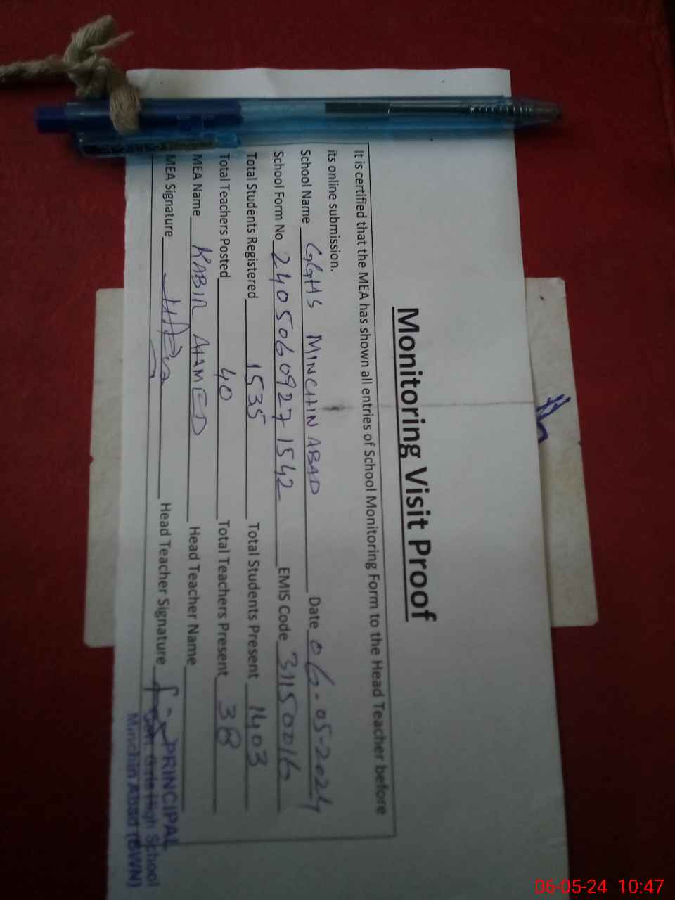 | Certified that this School was Inspected by the Undersigned MEA/DMO Today and the Information Stated Above is as Per Record. | |||||