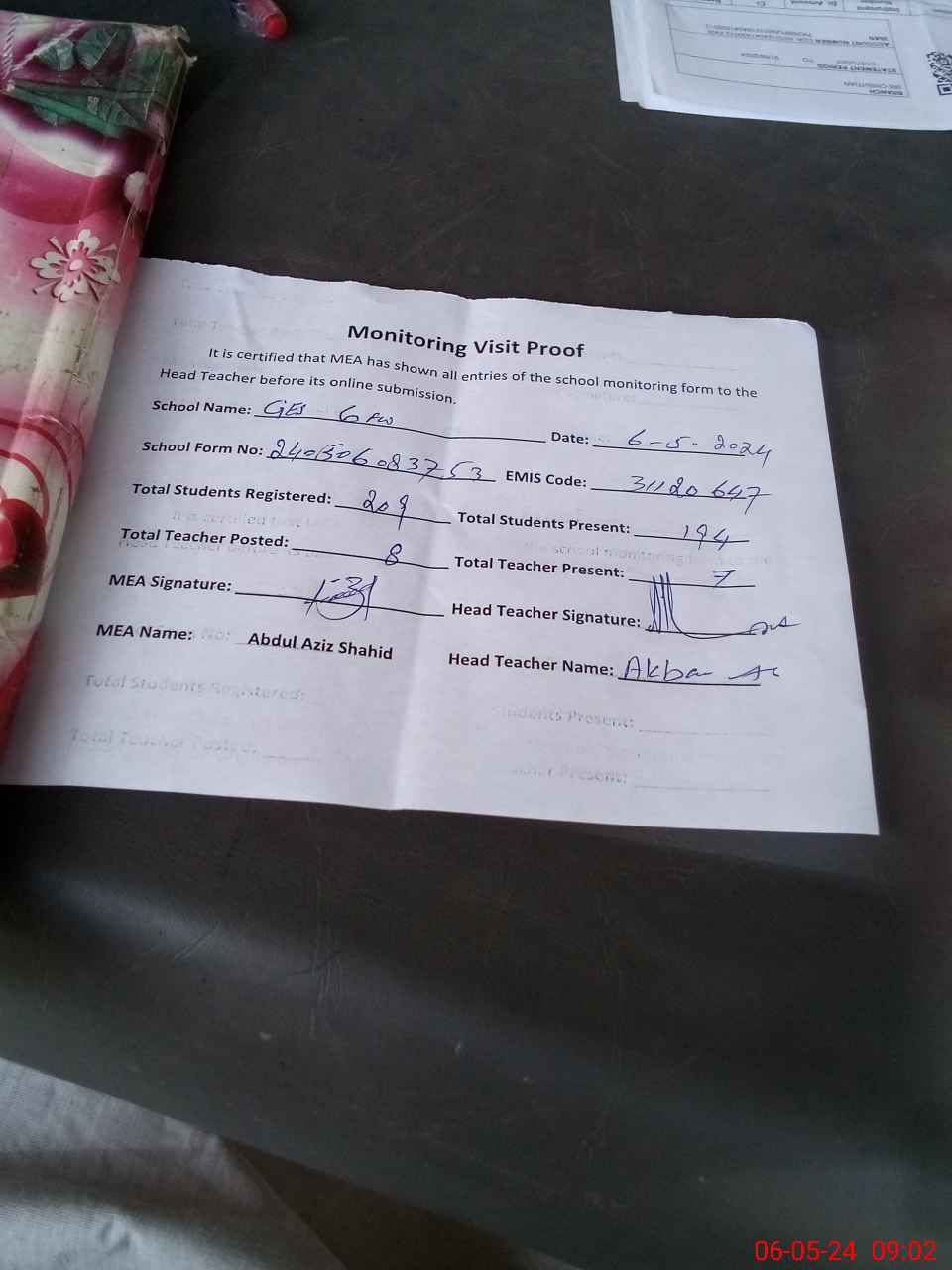 | Attendance Register | Head Teacher | MEA with School | Visit Proof |