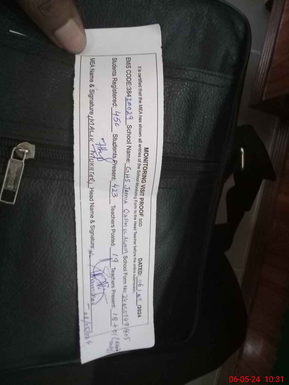 | Attendance Register | Head Teacher | MEA with School | Visit Proof |