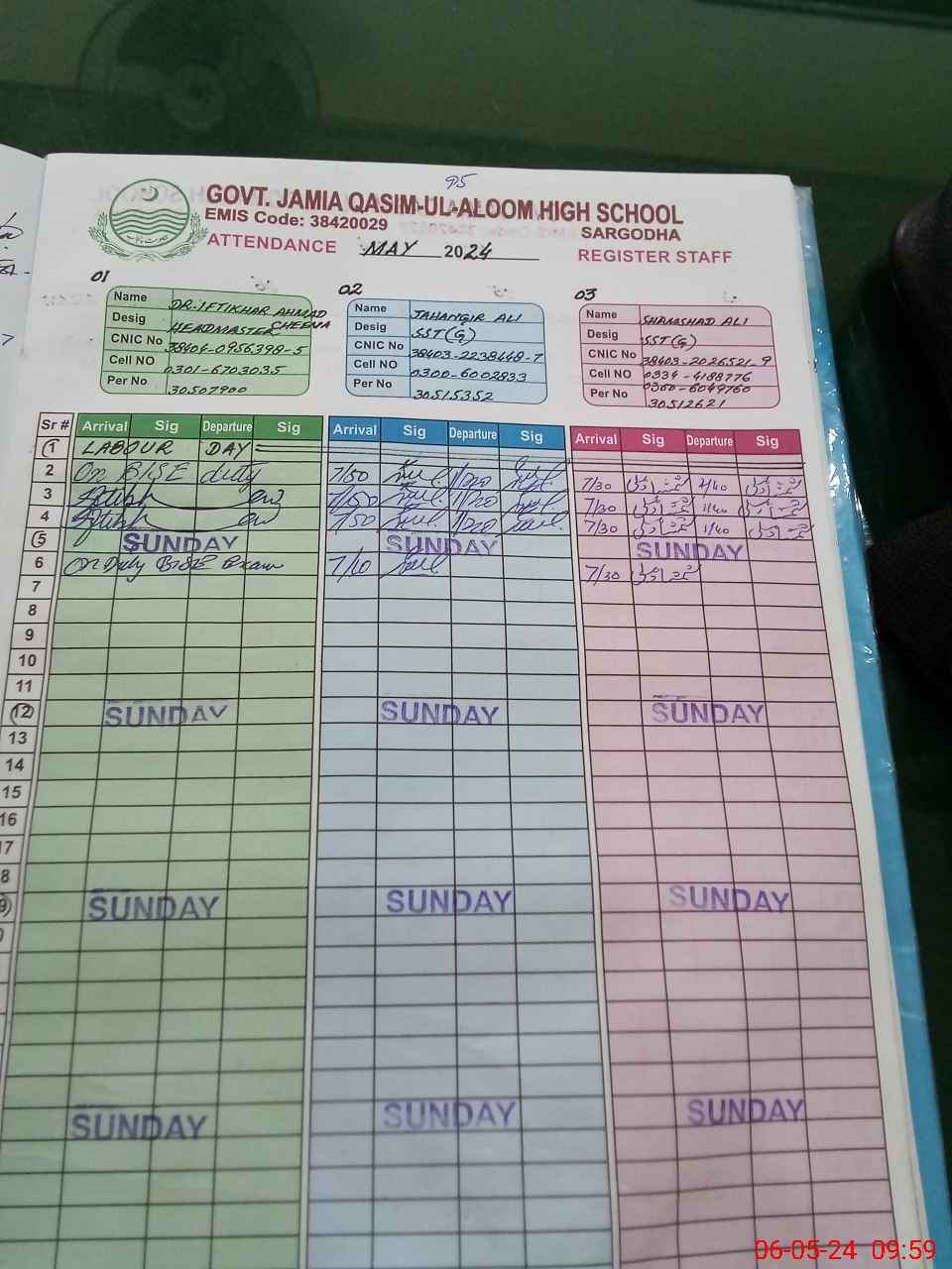 | CNIC | Full Name | Designation | R/C | Absence during last cal. month |