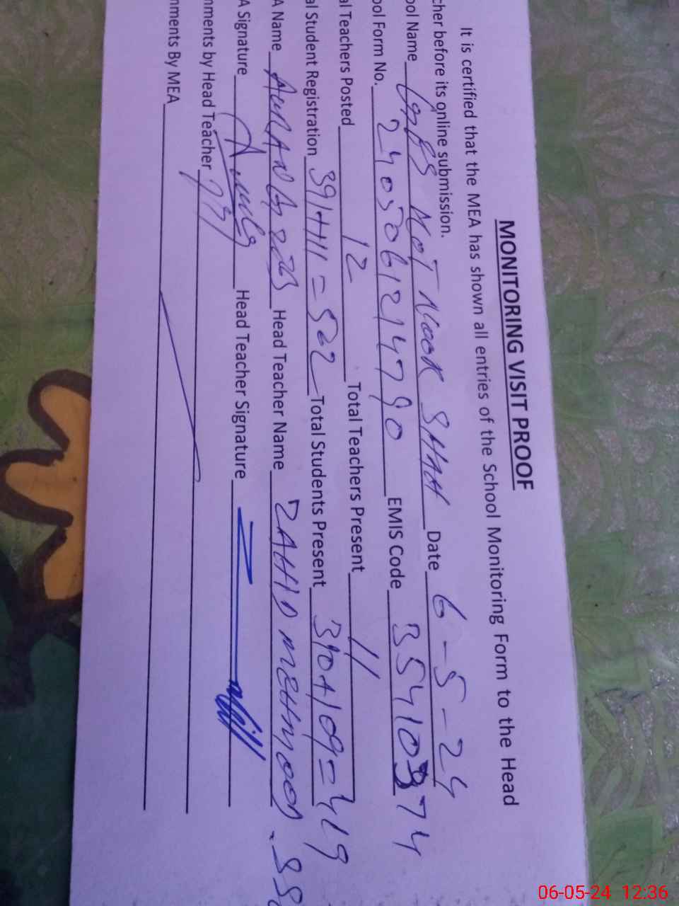 | Attendance Register | Head Teacher | MEA with School | Visit Proof |
