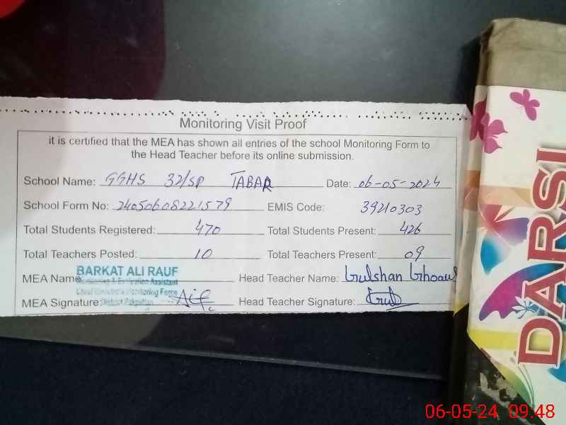 | EMIS Code: 39210303 | Name of School: GGHS CHAK NO.32 SP TABAR | |||