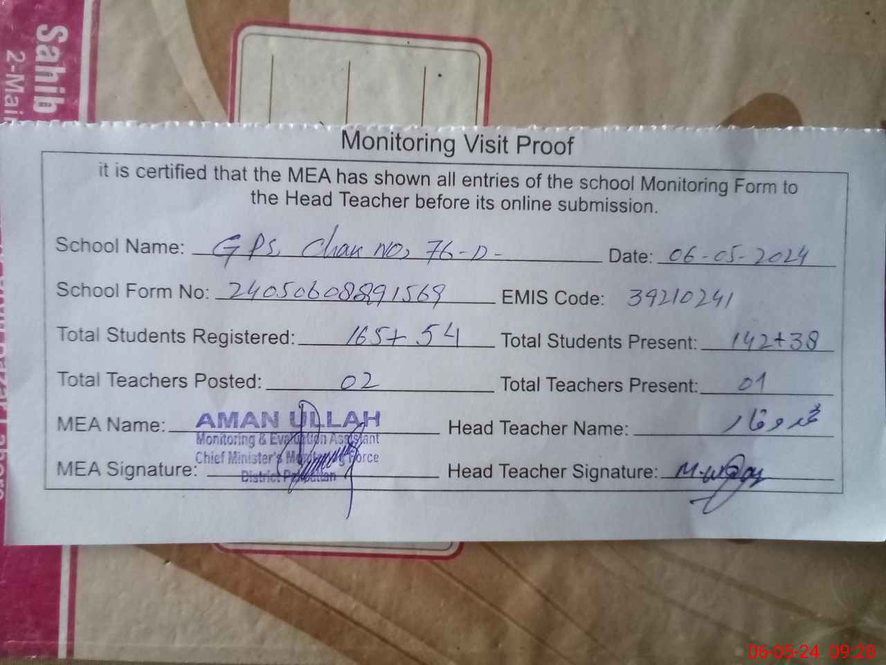 | EMIS Code: 39210241 | Name of School: GPS CHAK NO. 76/D | |||