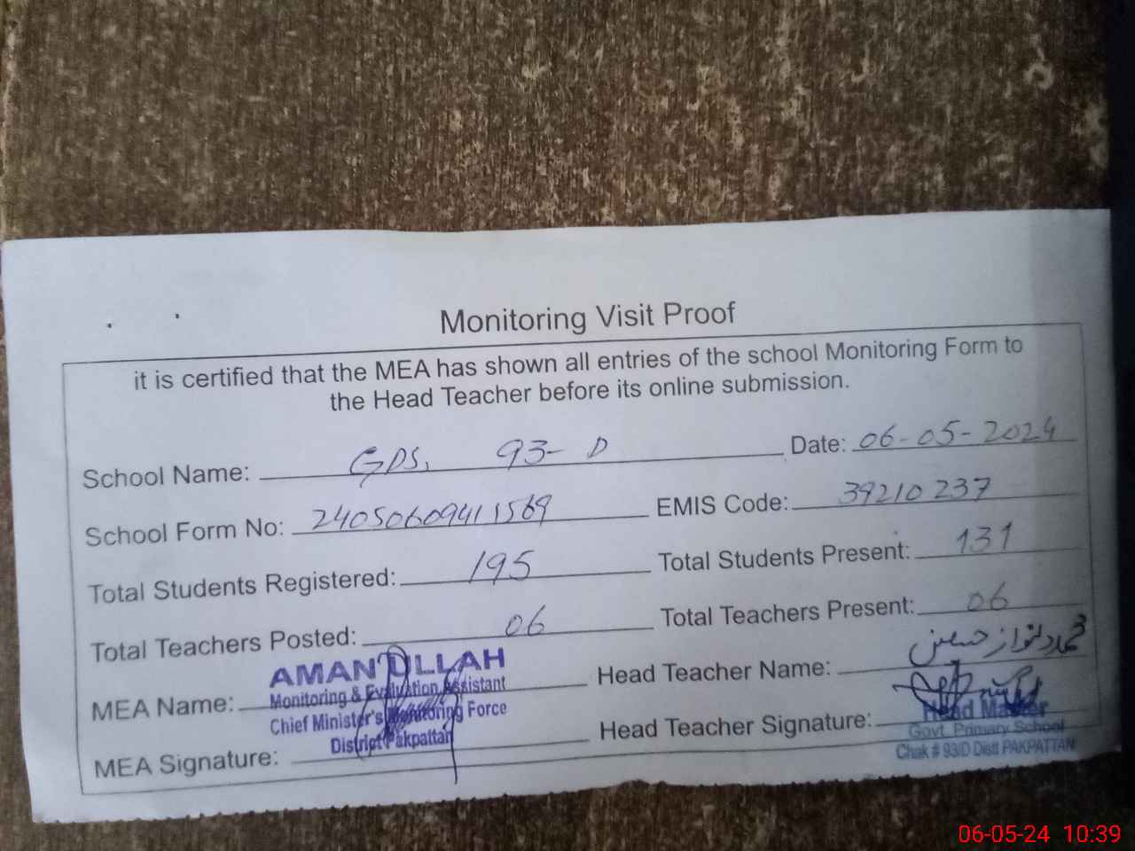 | Attendance Register | Head Teacher | MEA with School | Visit Proof |