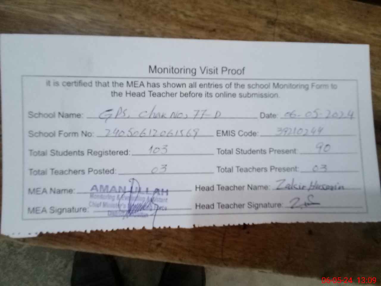 | Attendance Register | Head Teacher | MEA with School | Visit Proof |