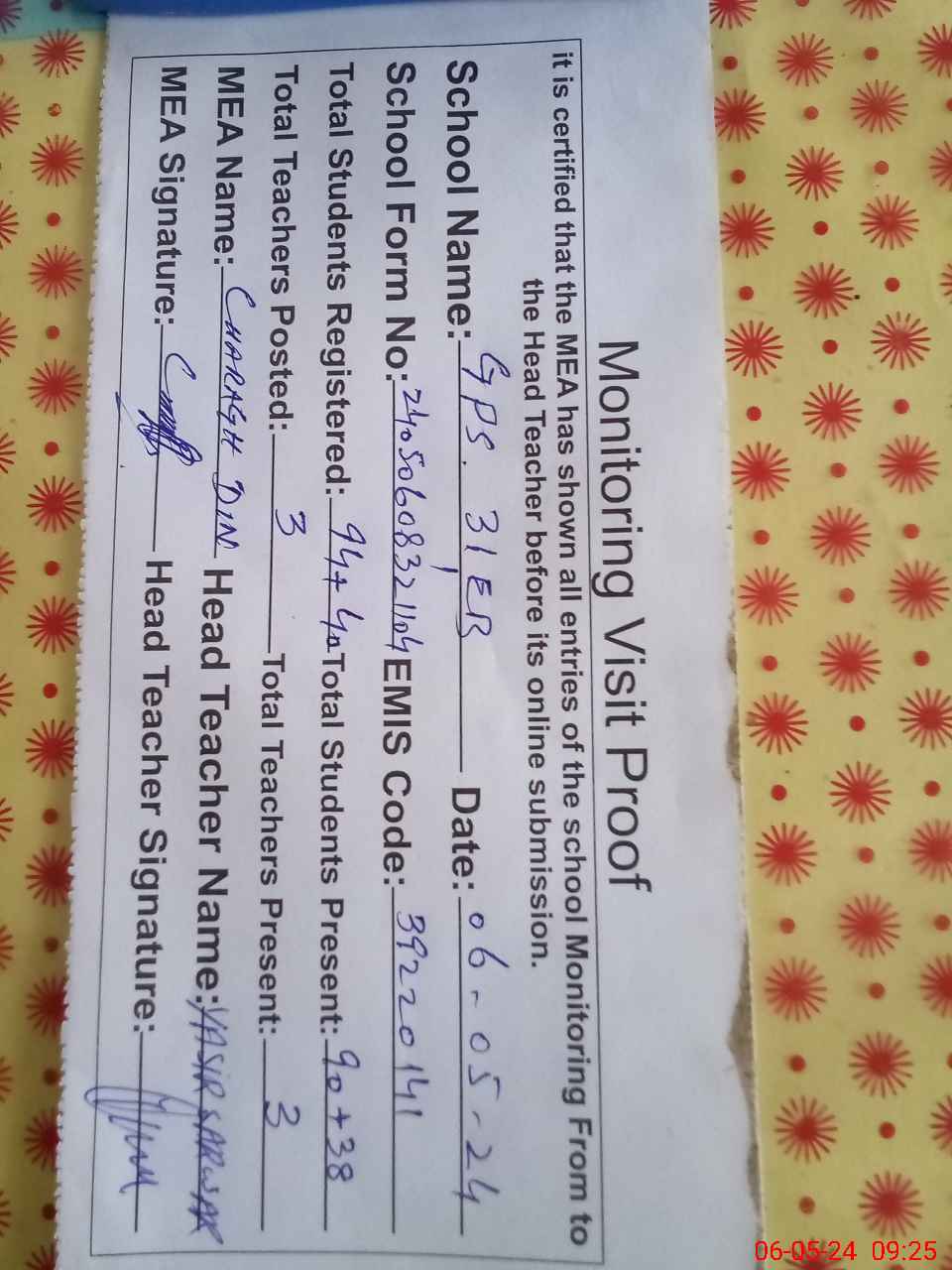 | Attendance Register | Head Teacher | MEA with School | Visit Proof |