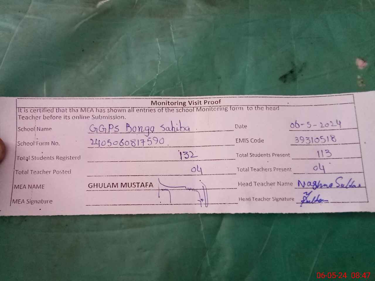 | Attendance Register | Head Teacher | MEA with School | Visit Proof |
