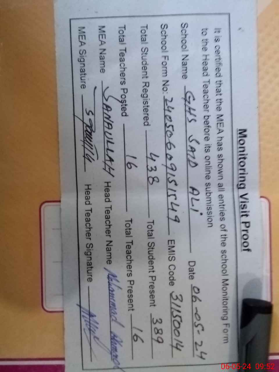 | Certified that this School was Inspected by the Undersigned MEA/DMO Today and the Information Stated Above is as Per Record. | |||||