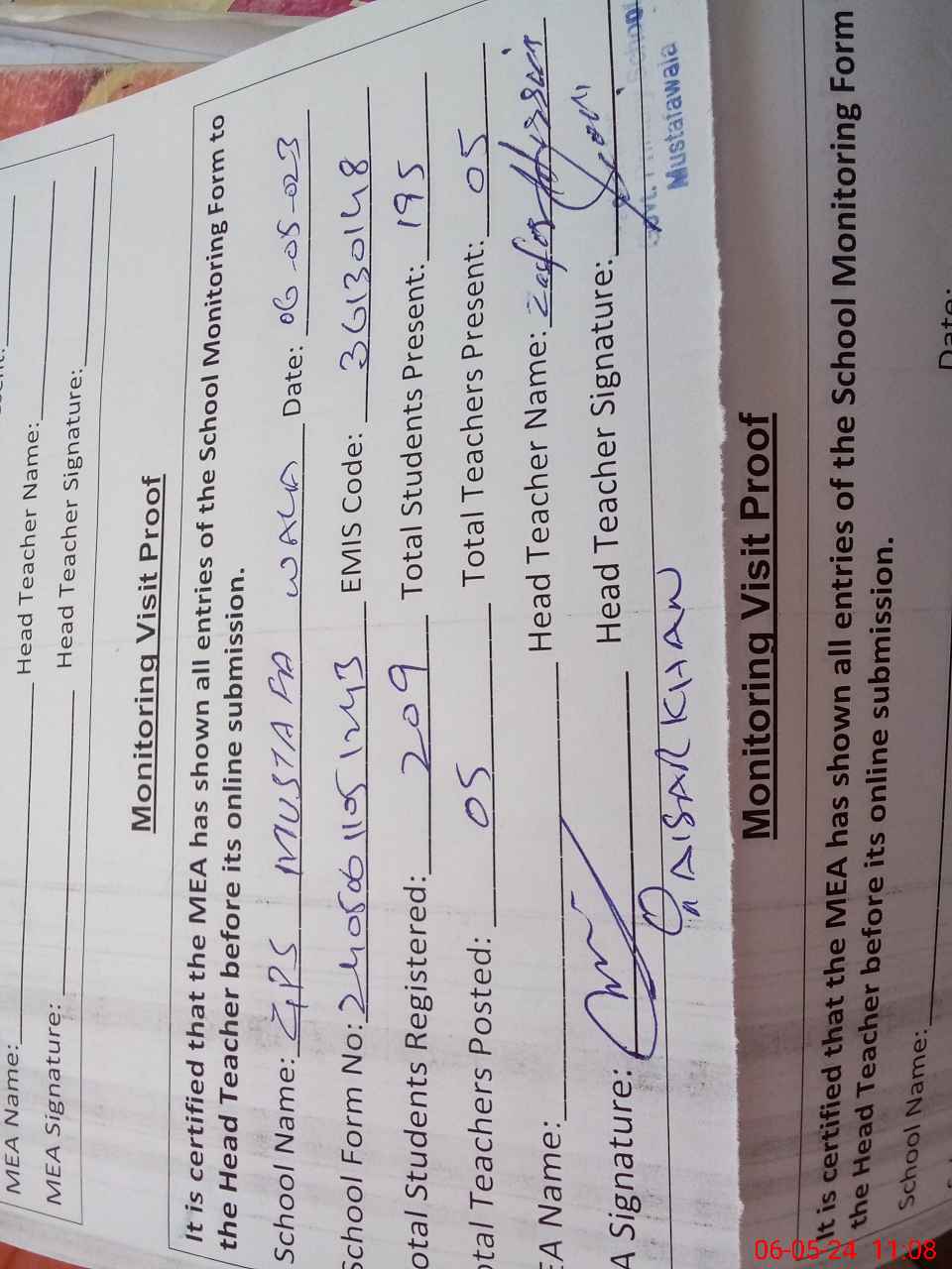 | Attendance Register | Head Teacher | MEA with School | Visit Proof |