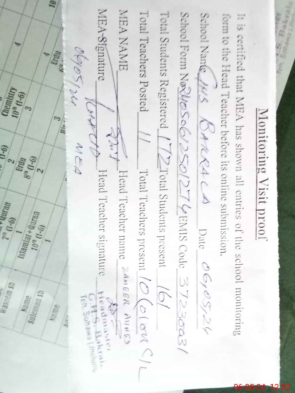 | Attendance Register | Head Teacher | MEA with School | Visit Proof |