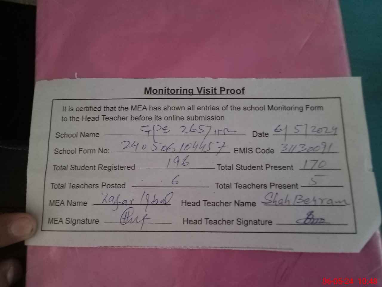 | Attendance Register | Head Teacher | MEA with School | Visit Proof |