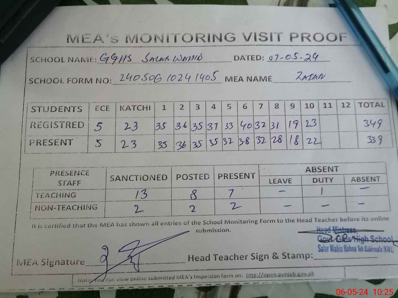 | Attendance Register | Head Teacher | MEA with School | Visit Proof |