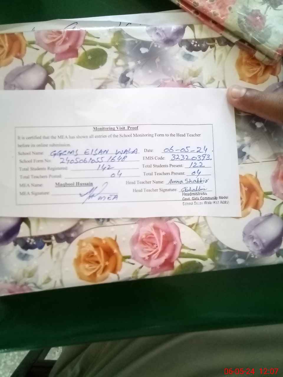 | Attendance Register | Head Teacher | MEA with School | Visit Proof |