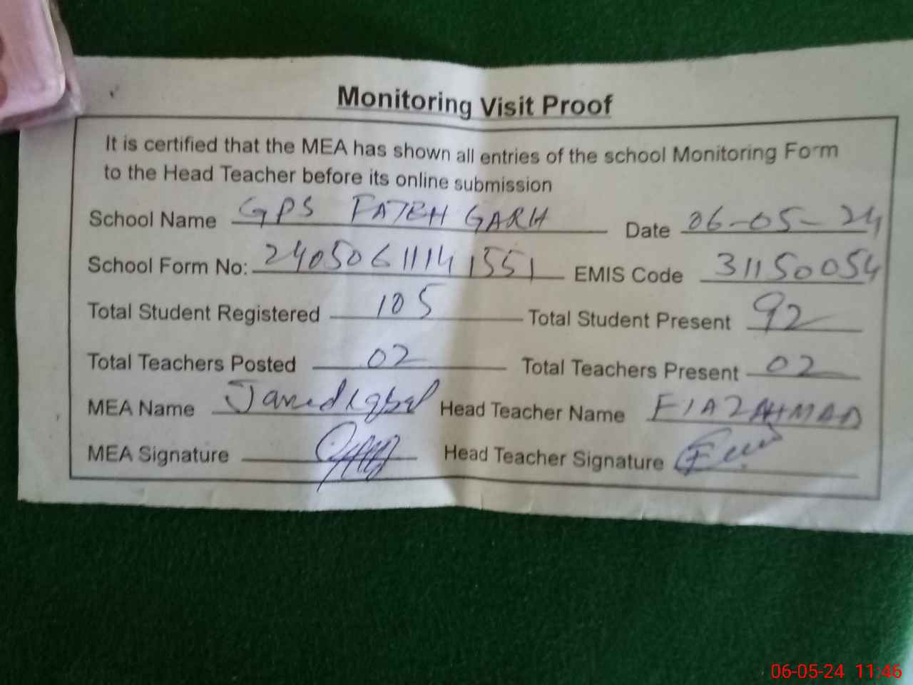 | Attendance Register | Head Teacher | MEA with School | Visit Proof |