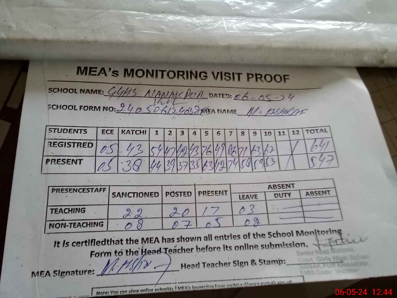 | Attendance Register | Head Teacher | MEA with School | Visit Proof |