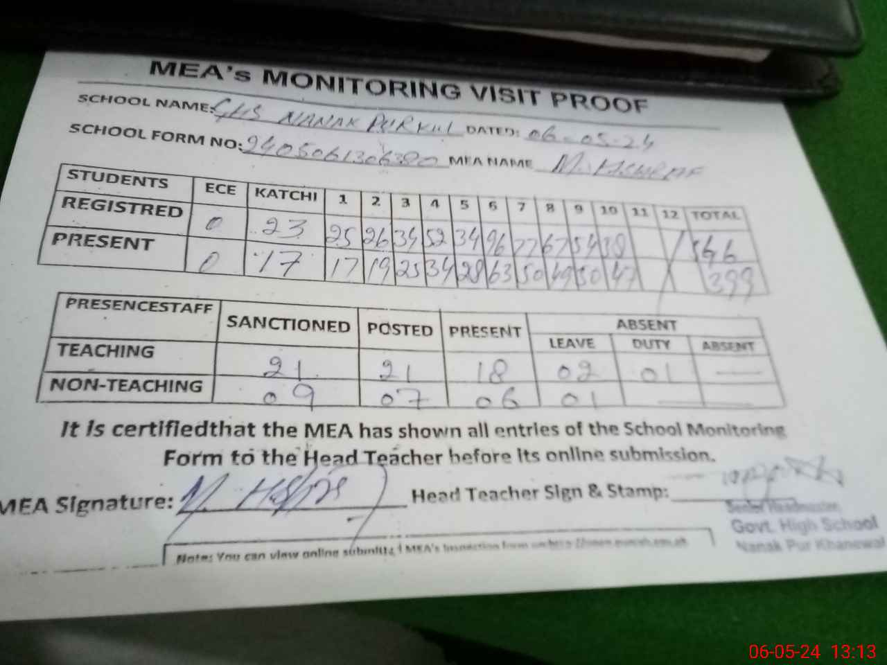 | Attendance Register | Head Teacher | MEA with School | Visit Proof |
