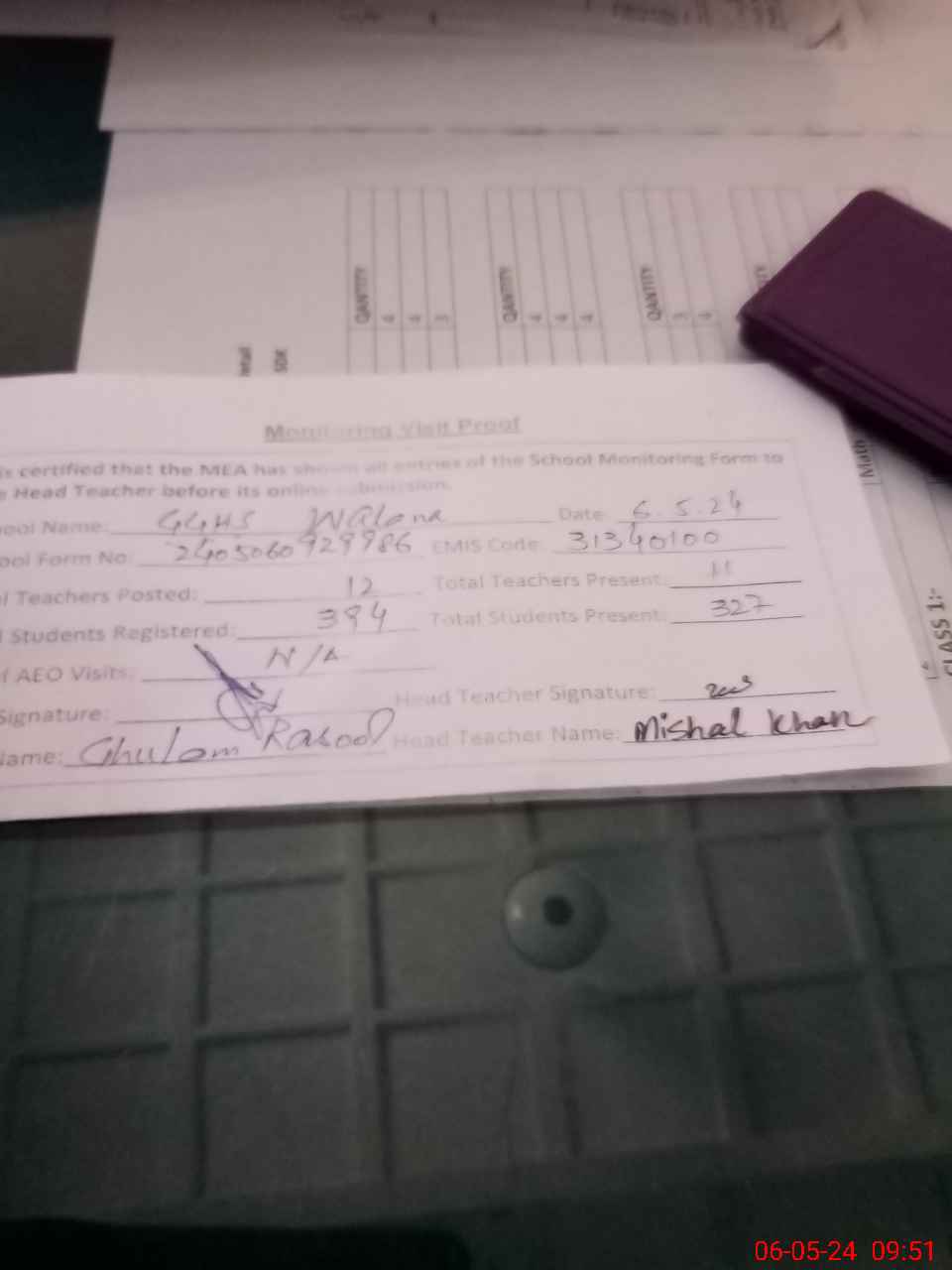| Monitoring Date: 06-05-2024 | Start Time: 06-05-2024 09:29 AM | End Time: 06-05-2024 09:57 AM | Name of MEA: Gh**** Ra**** | |