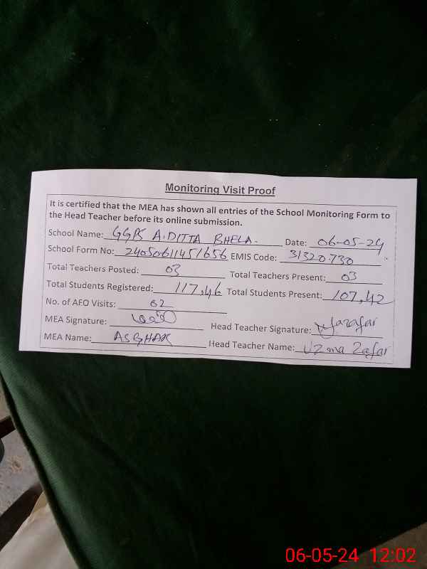 | EMIS Code: 31320730 | Name of School: GGPS ALLAH DITTA BEHLA | |||