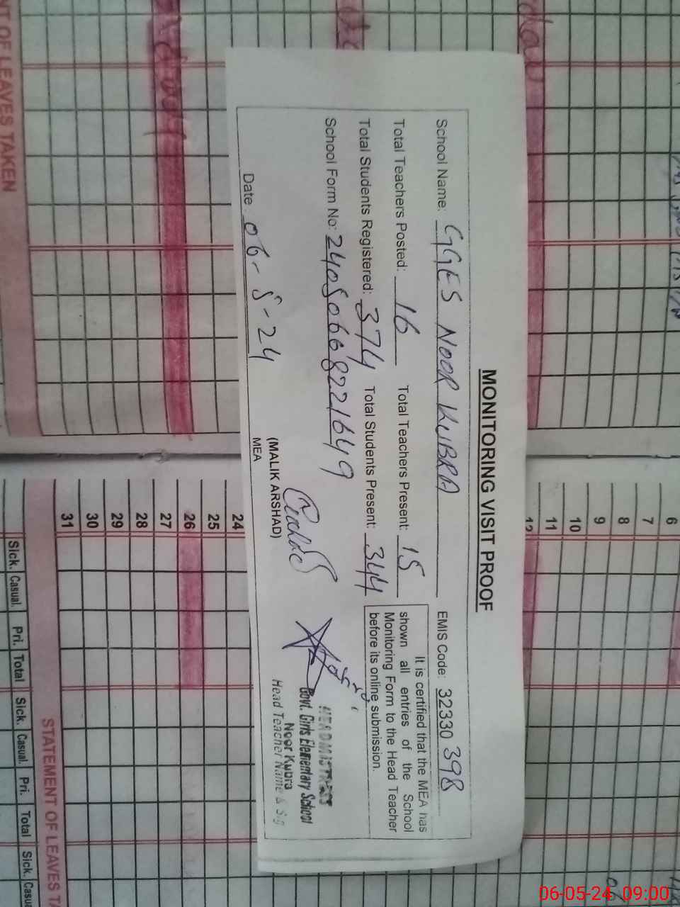 | Attendance Register | Head Teacher | MEA with School | Visit Proof |