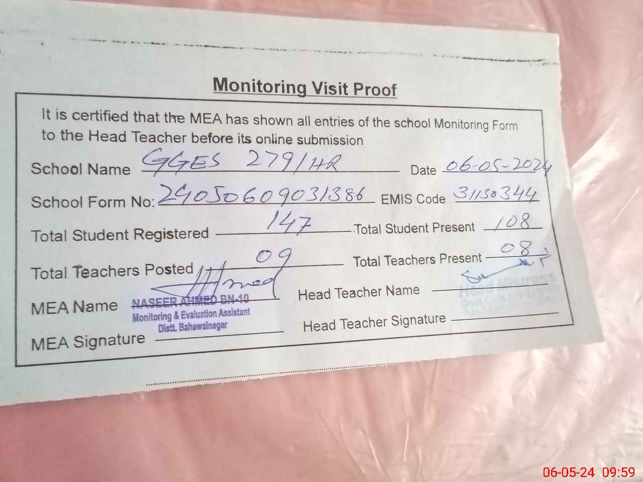 | EMIS Code: 31130344 | Name of School: GGES CHAK NO 279 HR | |||