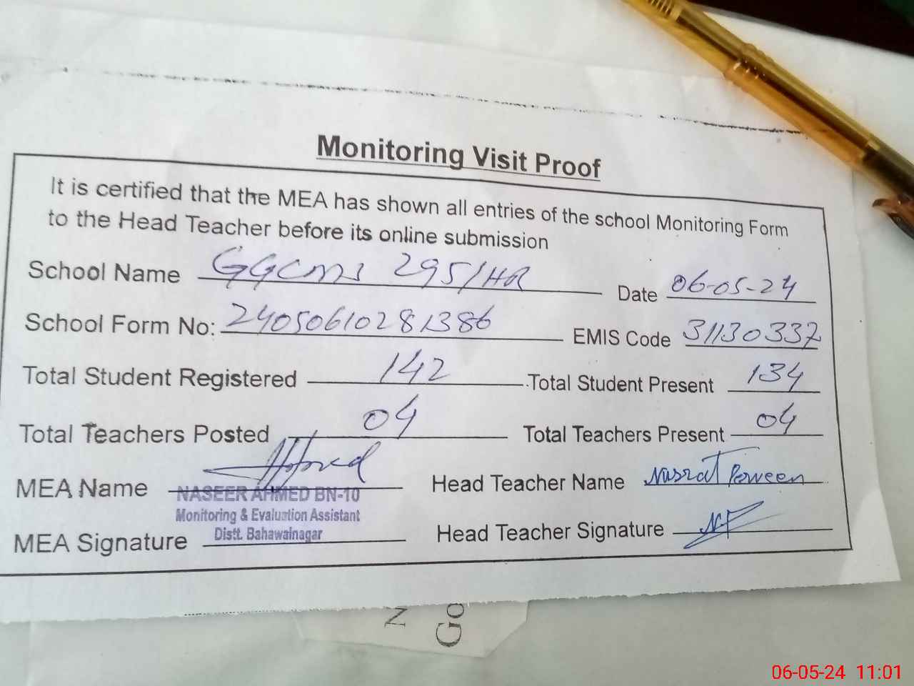 | Attendance Register | Head Teacher | MEA with School | Visit Proof |