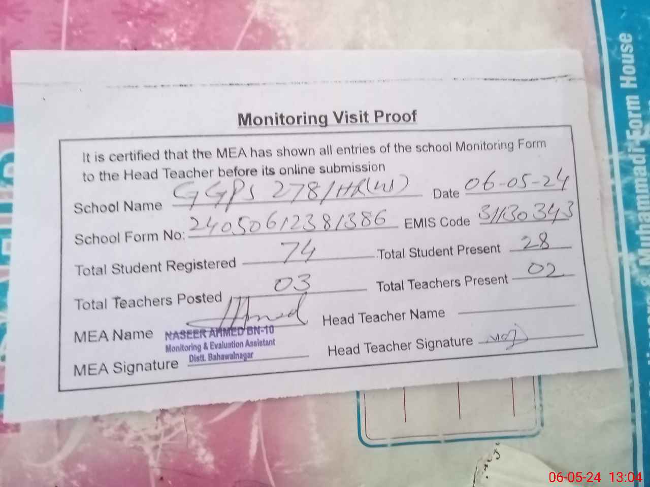 | EMIS Code: 31130343 | Name of School: GGPS CHAK NO 278 HR W | |||
