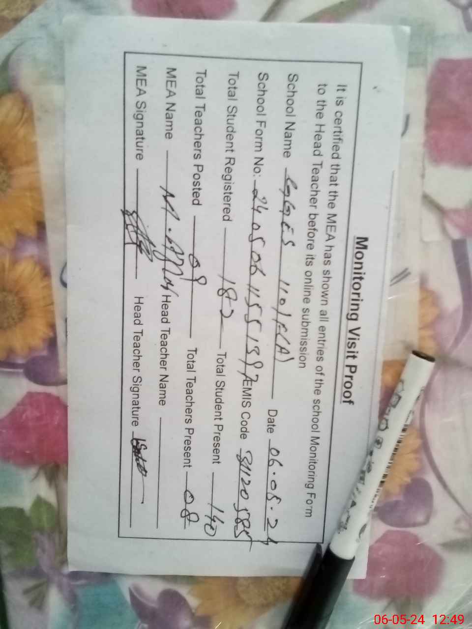 | Attendance Register | Head Teacher | MEA with School | Visit Proof |