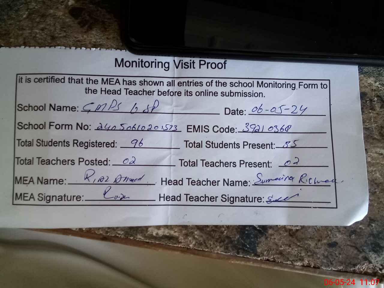 | Attendance Register | Head Teacher | MEA with School | Visit Proof |