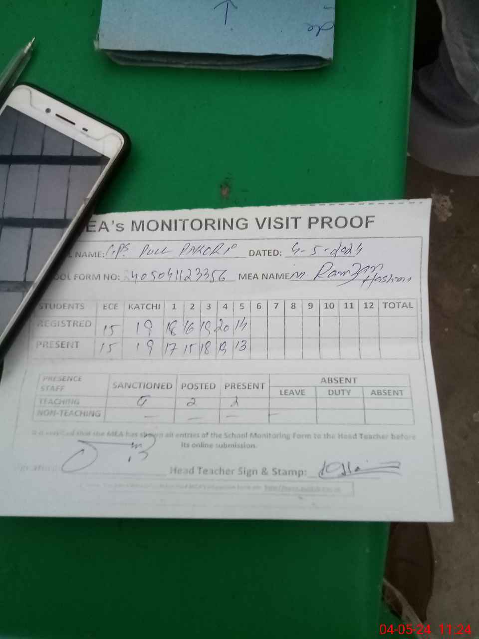 | Attendance Register | Head Teacher | MEA with School | Visit Proof |