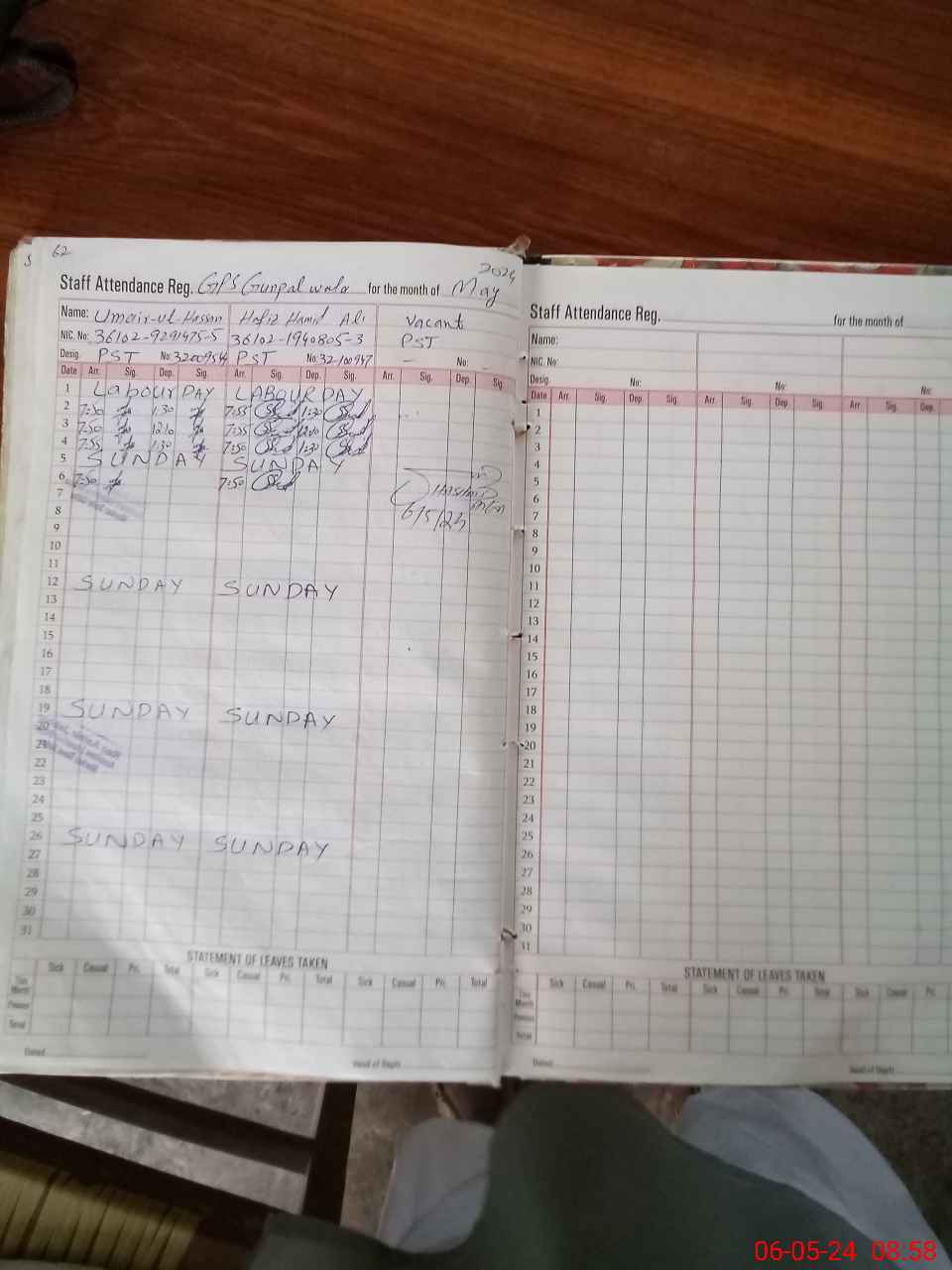 | CNIC | Full Name | Designation | R/C | Absence During Last Calender Month |