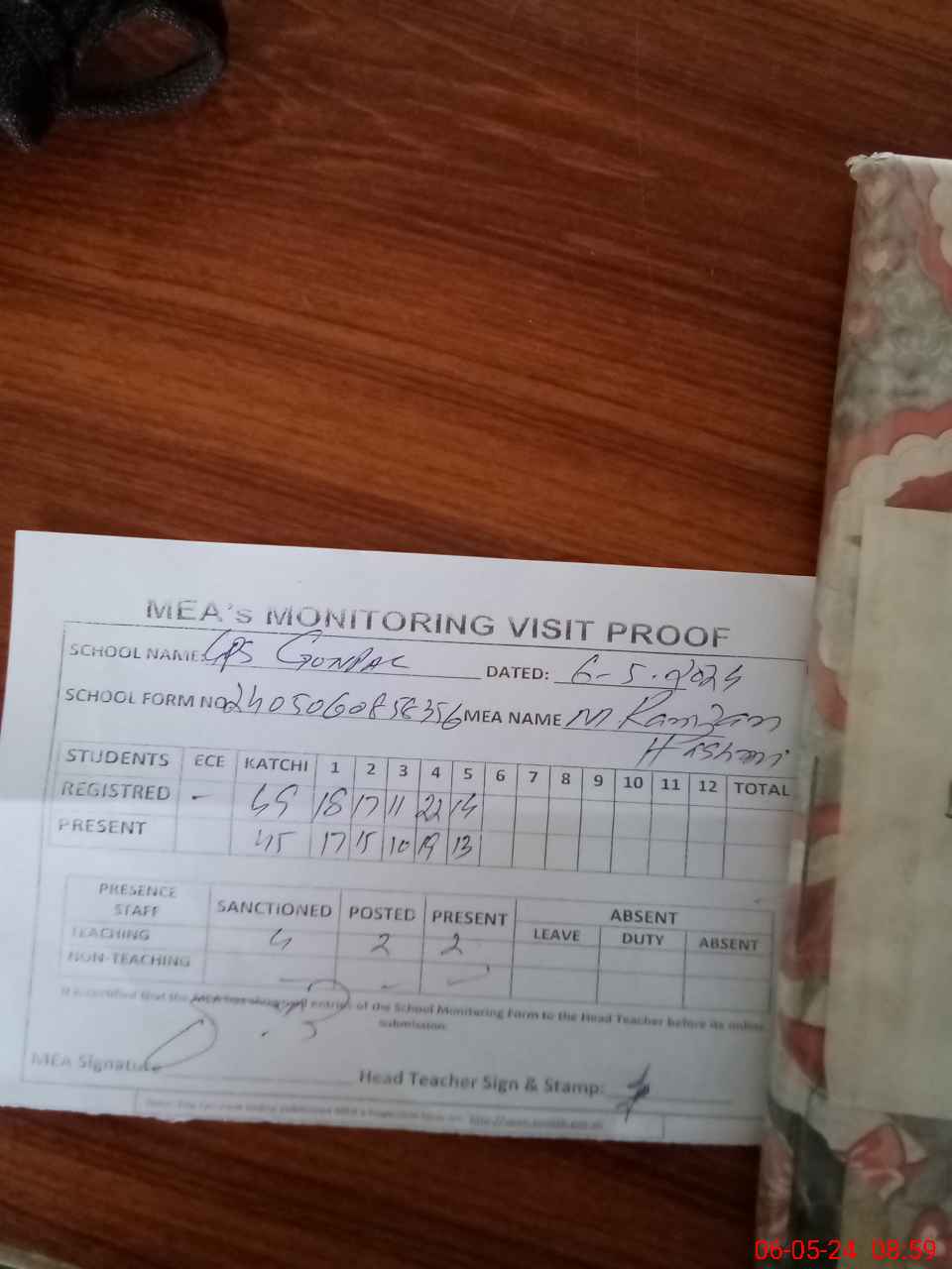 | Attendance Register | Head Teacher | MEA with School | Visit Proof |