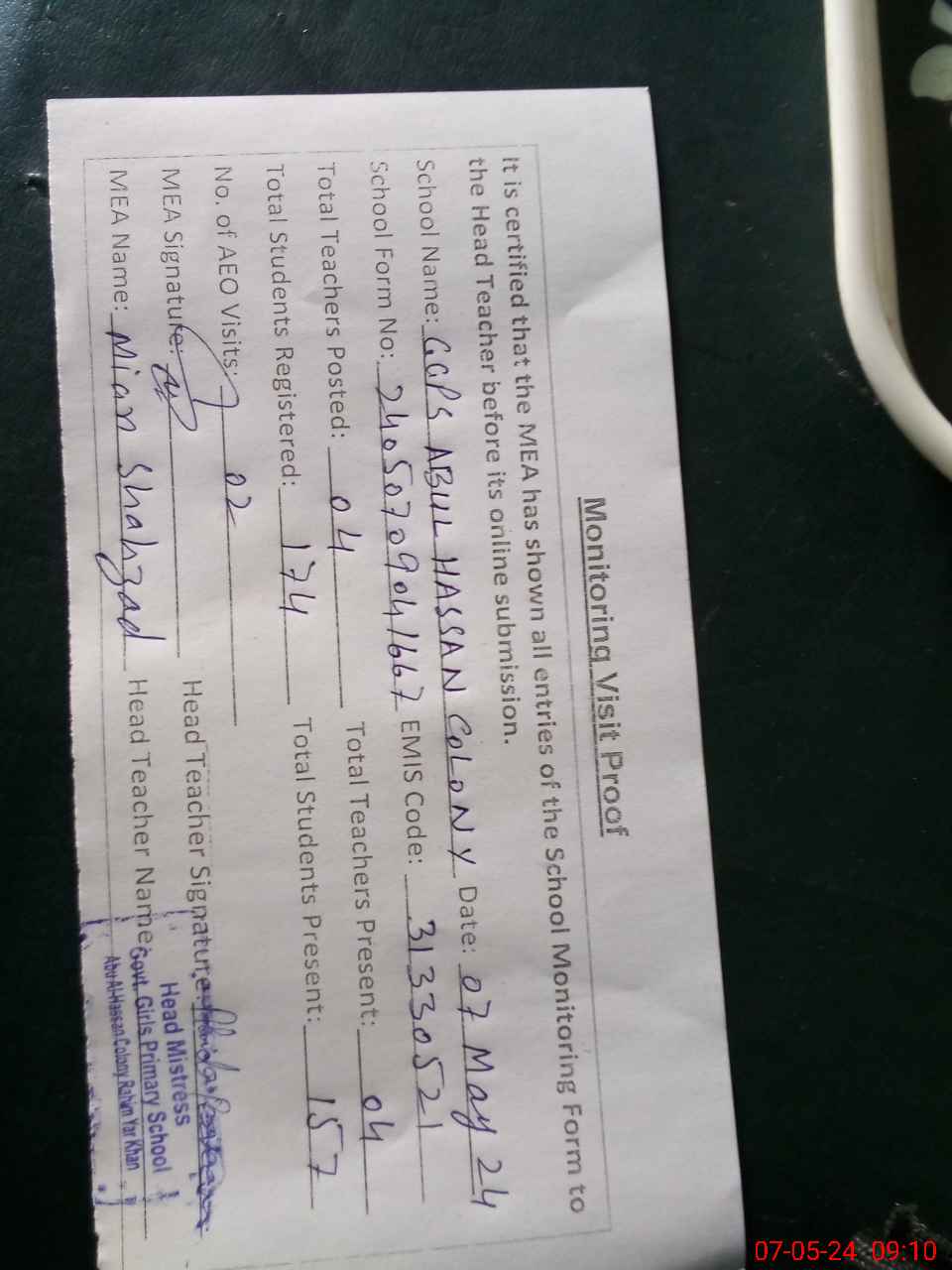 | Attendance Register | Head Teacher | MEA with School | Visit Proof |