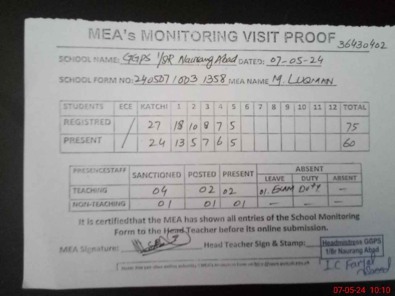 | Attendance Register | Head Teacher | MEA with School | Visit Proof |