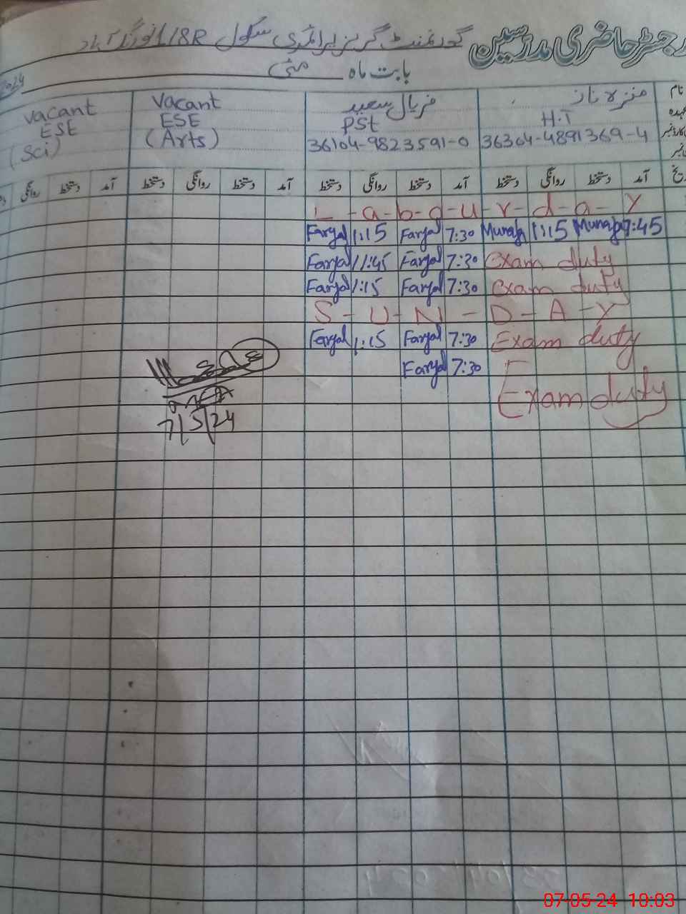 | 36**** | Mu**** Na**** | 1 | 1 | 0 | 0 | 0 | 0 | 0 | 0 | 0 | 0 | 0 | Exam Duty |