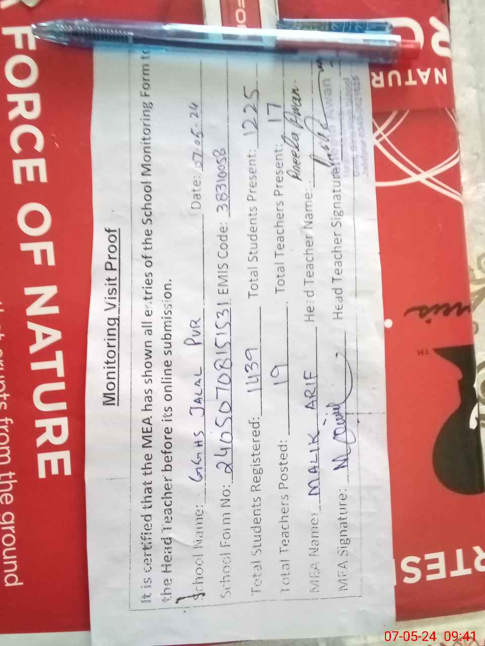 | Attendance Register | Head Teacher | MEA with School | Visit Proof |