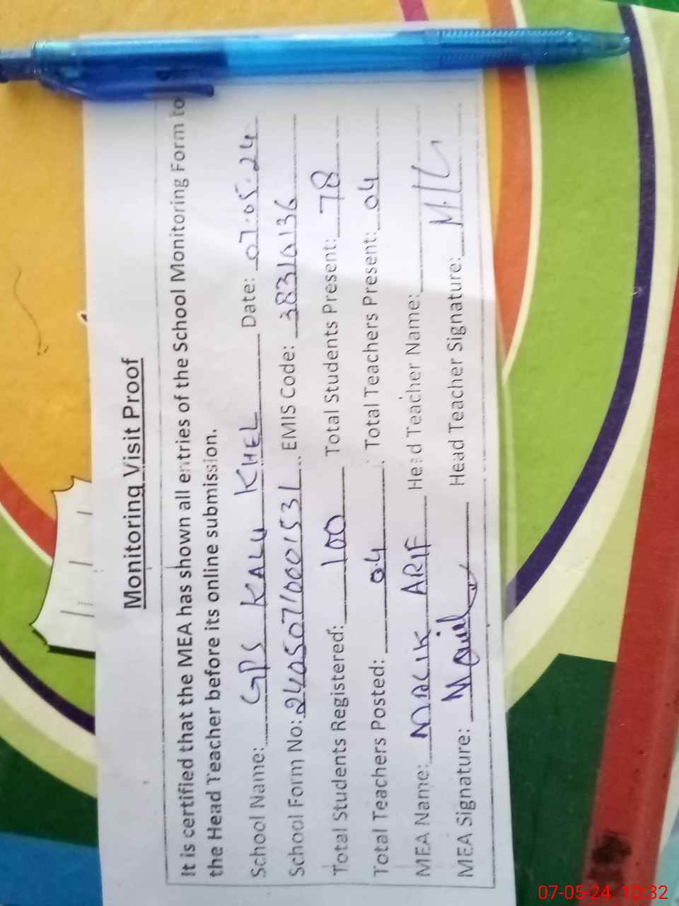 | Attendance Register | Head Teacher | MEA with School | Visit Proof |